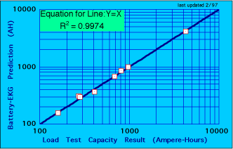 Shown in the plot above is a comparison between overall battery capacity, as determined by our computational model, and independent load tests on valve-regulated and flooded batteries, with rated capacities from approximately 100 to 4000 ampere hours and actual capacities from approximately 30 to 100 percent. The coefficient of determination for BATTERY - EKG is over .997. The equation used for fitting the data is simply y=x, with no other parameters, and using the same computational model in all cases. To our knowledge, this represents the best statistical fit in the industry, by a significant margin.