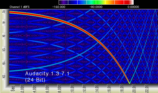 Pure Vinyl Sample Rate Converter: Signal Integrity / Purity Test A perfect result for a sample rate converter is a single trace with no spurious generated tones (completely black background), and little or no "V" reflection (aliasing) after the sweep passes 22.05 kHz, which is the Nyquist limit (this happens at about 19.5 seconds on the spectrogram display).Anything besides a single, parabolic trace represents unwanted distortion and audio "dirt" added to the signal. Test Conditions:
